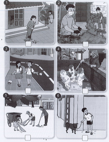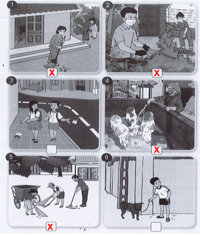 Vở bài tập Tự nhiên xã hội lớp 3 trang 11 bài 1: Đánh dấu X và ô trống dưới hình thể hiện việc làm để giữ vệ sinh xung quanh nhà ở.