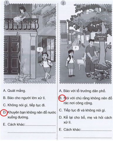 Nếu em nhìn thấy bạn đang đứng trên tầng đổ nước xuống đường em sẽ khuyên bạn không nên làm như vậy vì vừa làm mất mỹ quan nhà ở vừa gây ảnh hưởng đến người đi đường. Ví dụ, nếu có ai đi qua lúc bạn nữ đổ nước xuống sẽ làm người đi đường bị ướt.
