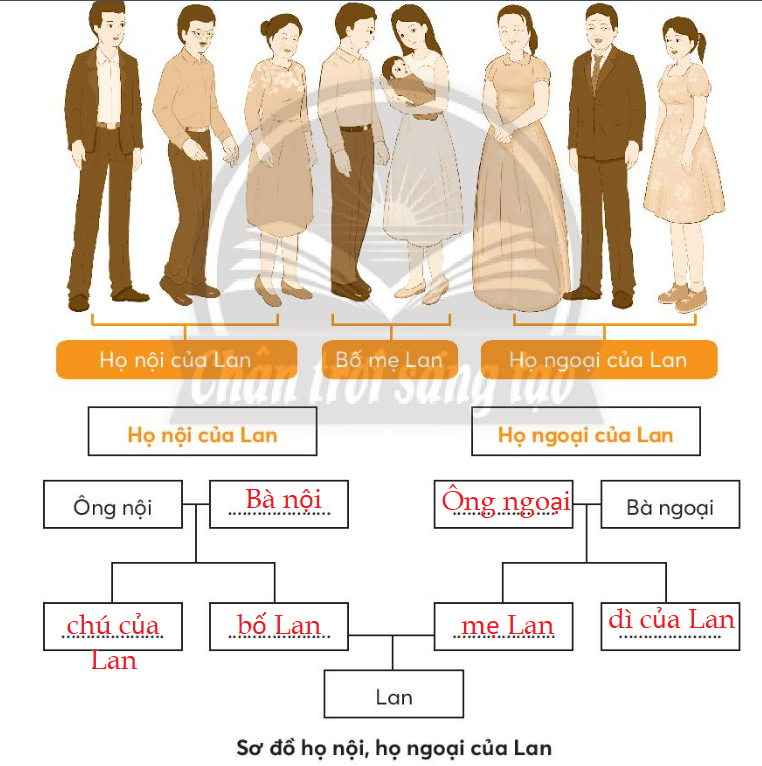 Vở bài tập Tự nhiên xã hội lớp 3 trang 5 bài 1: Quan sát hình và viết vào chỗ (….) để hoàn thành sơ đồ họ nội, họ ngoại của bạn Lan.