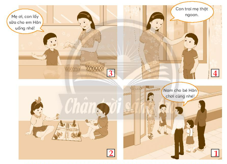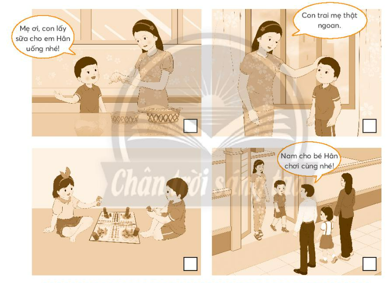 Vở bài tập Tự nhiên xã hội lớp 3 trang 6 bài 3: Điền số từ 1 đến 4 vào ô trống ở mỗi hình để chỉ thứ tự của một câu chuyện. Viết vào chỗ (….) điều em học được từ câu chuyện này.