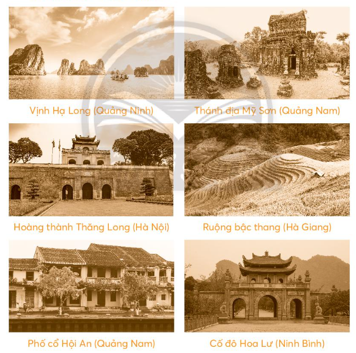 Thánh địa Mỹ Sơn (Quảng Nam) Hoàng thành Thăng Long (Hà Nội) Cố đô Hoa Lư (Ninh Bình) Phố cổ Hội An (Quảng Nam) |