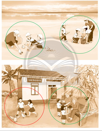 Vở bài tập Tự nhiên xã hội lớp 3 trang 20 bài 4: Khoanh màu xanh vào hình những bạn có hành vi đúng. Khoanh màu đỏ vào hình những bạn có hành vi chưa phù hợp trong các hình sau.