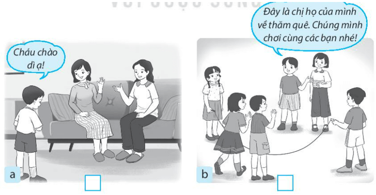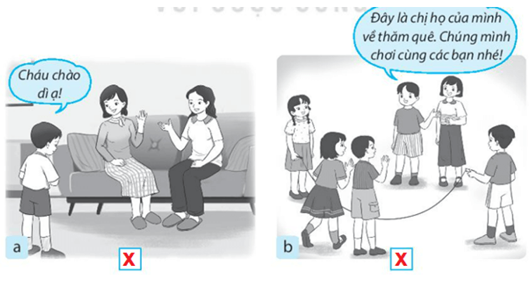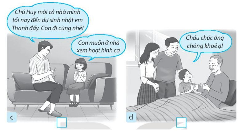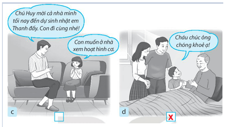 Vở bài tập Tự nhiên xã hội lớp 3 trang 6 bài 2: Đánh dấu X vào ô trống dưới những hình thể hiện việc em nên làm đối với các thành viên trong gia đình họ hàng.