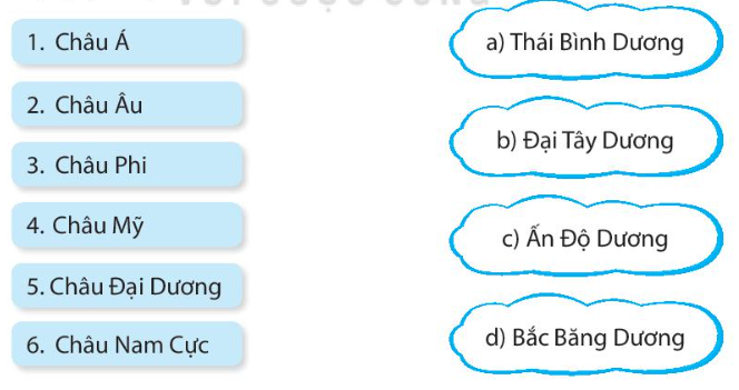 Vở bài tập Tự nhiên xã hội lớp 3 trang 70 bài 3: Quan sát hình 2 trang 111 (SGK) và nối từng châu lục với các đại dương tiếp giáp cho phù hợp.