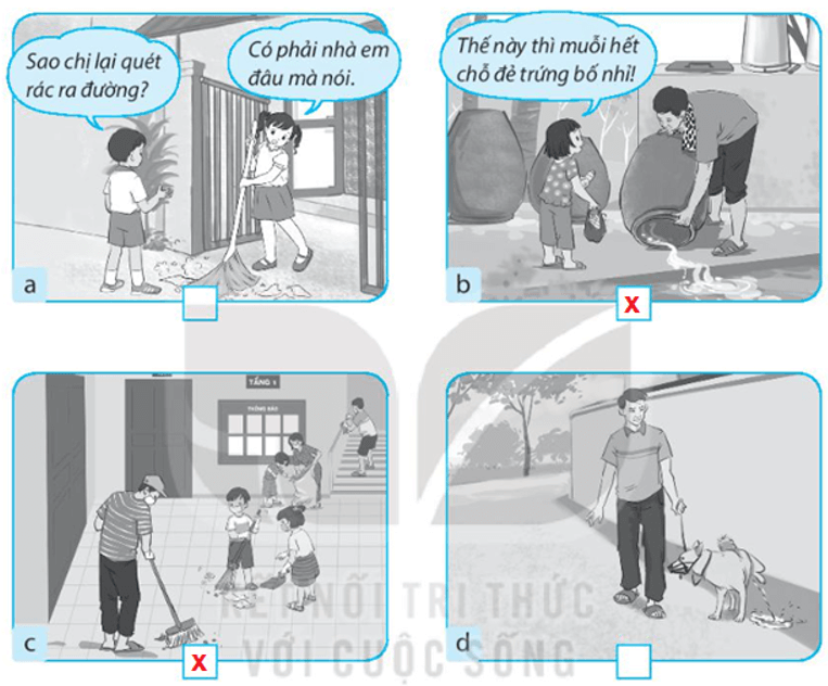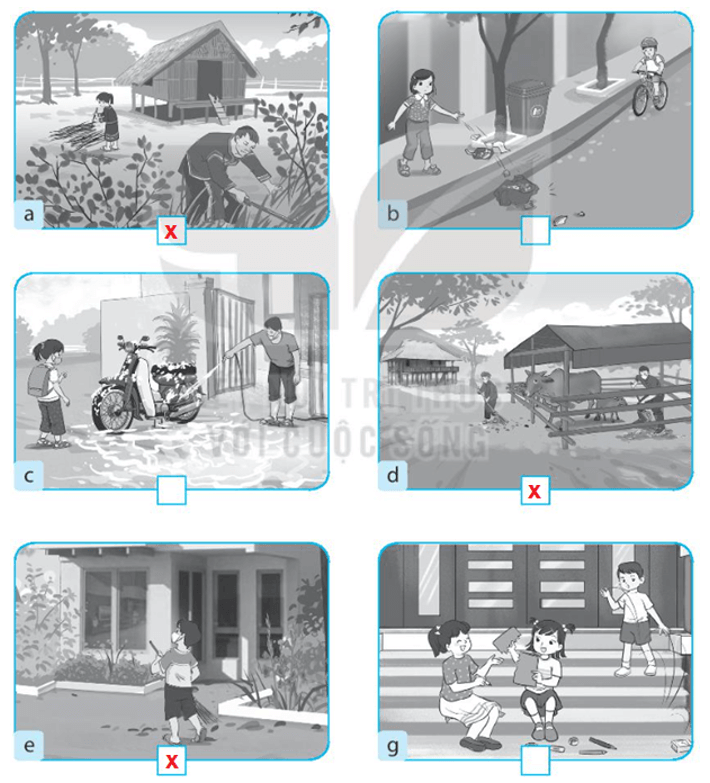 Vở bài tập Tự nhiên xã hội lớp 3 trang 14 bài 4: Đánh dấu X vào ô trống dưới những hình chỉ việc làm mà em đồng tình để giữ vệ sinh xung quanh nhà.