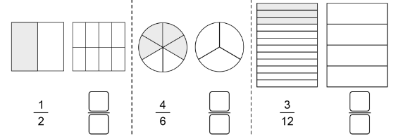 b) Tô màu vào hình và viết phân số thích hợp để có cặp phân số bằng nhau: