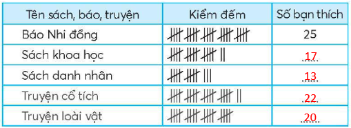 Em có thể hỏi từng bạn trong lớp xem loại phần thưởng nào bạn đó thích nhất sau đó điền vào bảng.