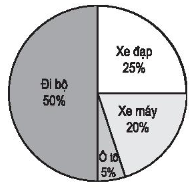 Biểu đồ hình quạt bên cho biết tỉ số phần trăm các phương tiện được sử dụng để đến trường học của 40 học sinh trong một lớp bán trú.