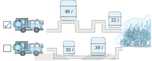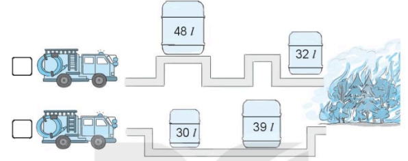 Mỗi xe cứu hỏa đến đám cháy theo một con đường. Mỗi xe sẽ lấy hết nước trong bình đặt trên con đường đó. Đánh dấu vào ô trống đặt trước xe lấy được nhiều nước hơn.