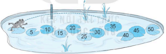 Bạn ếch tham gia thi nhảy xa. Lần thứ nhất xuất phát từ lá sen, bạn ấy nhảy qua 6 lá và được 35 điểm (như hình vẽ). Lần thứ hai, cũng xuất phát từ lá sen đó, bạn ấy nhảy qua 8 lá.