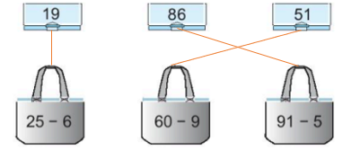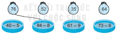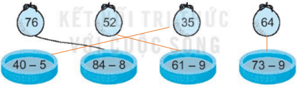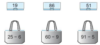 Mỗi chiếc ví sẽ được đặt vào chiếc túi ghi phép tính có kết quả là số ghi trên chiếc ví đó. Em hãy nối để tìm túi đựng cho mỗi chiếc ví.