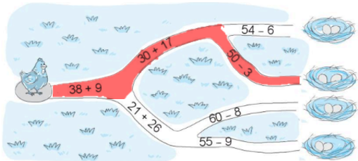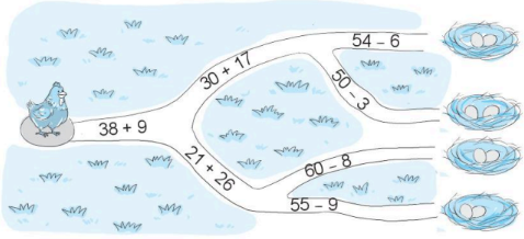 Đường đến ổ rơm của gà mái mơ đi qua ba phép tính có kết quả bằng nhau. Hãy tô màu cho đường đi đến ổ rơm của gà mái mơ.