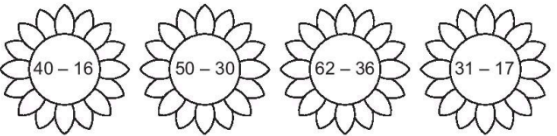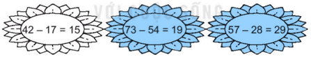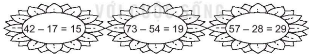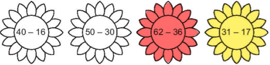 Sau khi thực hiện phép tính, em thấy bông hoa ghi phép tính 62 – 36 (bằng 26) có kết quả lớn nhất nên được tô màu đỏ, bông hoa ghi phép tính 31 – 17 (bằng 14) có kết quả bé nhất nên được tô màu vàng.