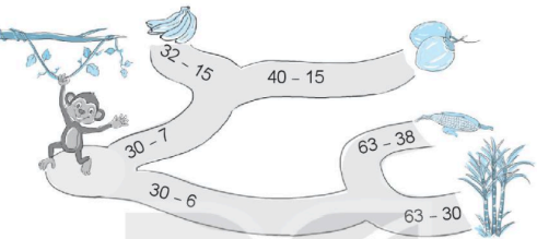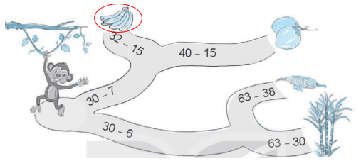 Ta có: 30 – 7 < 30 – 6 ; 32 – 15 < 40 – 15 nên bạn khỉ sẽ ăn quả chuối. Em khoanh như sau:
