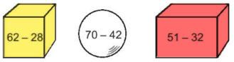 b) Tô màu vàng vào hình khối ghi phép tính có kết quả lớn nhất, màu đỏ vào hình khối ghi phép tính có kết quả bé nhất.