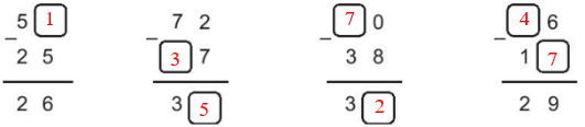 Em thực hiện trừ nhẩm lần lượt chữ số hàng đơn vị, rồi đến chữ số hàng chục và được kết quả như sau: