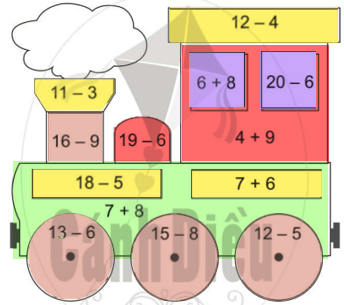 Tô màu theo chỉ dẫn: Các phép tính có kết quả là 13 tô màu đỏ, 7 tô màu nâu, 8 tô màu vàng, 15 tô màu xanh lá cây, 14 tô màu tím.