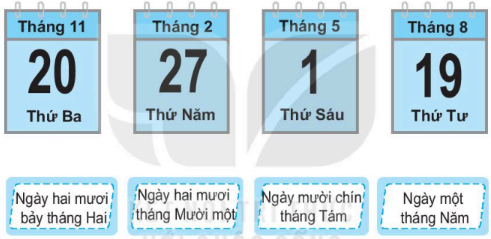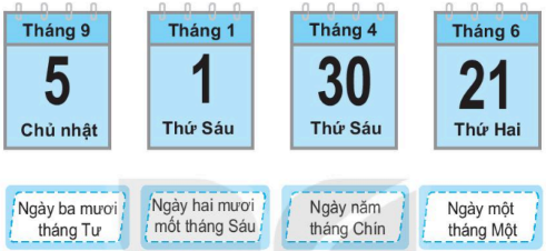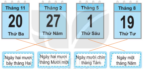 Nối cách đọc ngày, tháng ứng với mỗi tờ lịch.