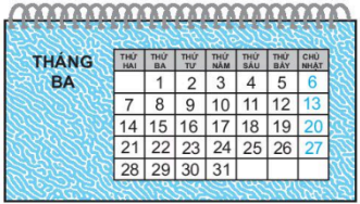 Xem tờ lịch tháng 3 sau đây rồi viết câu trả lời.
