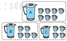 Có ba bình chứa đầy nước. Bạn Mai đã rót hết nước ở các bình sang đầy các ca 1 l thì được số ca 1 l tương ứng hình vẽ.