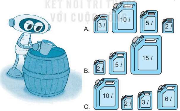 Trong thùng nước có 20 l nước. Múc hết nước từ thùng rót đầy vào các can. Có thể rót vào đầy tất cả các can trong phương án nào sau đây?