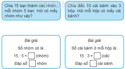 Chia đều 15 cái bánh vào 3 hộp. Mỗi hộp có số cái bánh là: 15 : 3 = 5 (cái bánh)