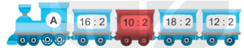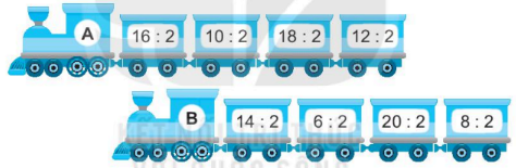 b) Từ kết quả câu a ta thấy ở đoàn tàu A, phép tính 10 : 2 = 5 có kết quả bé nhất, nên tô màu đỏ