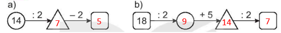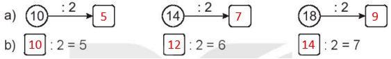 a) Có: 16 : 2 = 8; 10 : 2 = 5; 18 : 2 = 9; 12 : 2 = 6; 14 : 2 = 7; 6 : 2 = 3, 20 : 2 = 10, 8 : 2 = 4