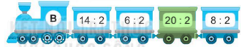 c) Từ kết quả câu a ta thấy ở đoàn tàu B, phép tính 20 : 2 = 10 có kết quả lớn nhất, nên tô màu xanh