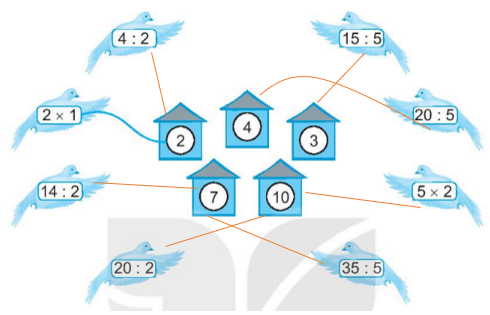 Thực hiện phép tính trong con chim, rồi nối kết quả phép tính với cái chuồng tương ứng