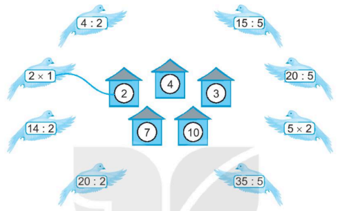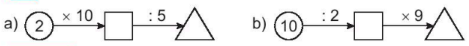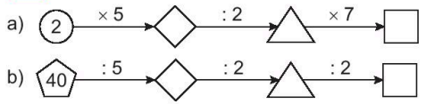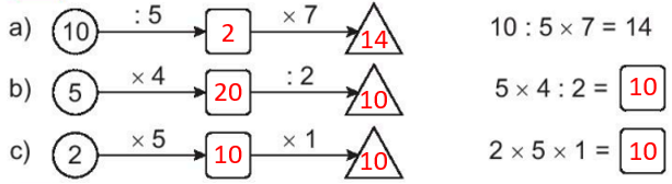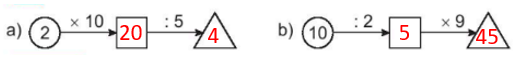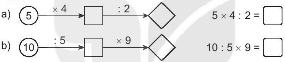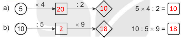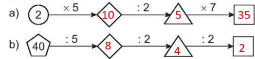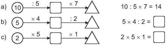 | a) 5 × 1 = 5 ; 2 × 1 = 2 | b) 4 : 2 = 2 ; 10 : 5 = 2 |