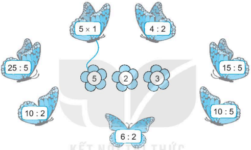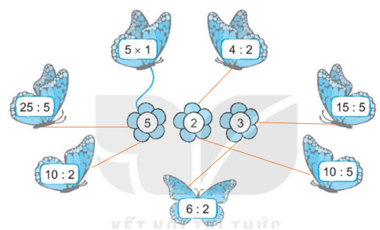 Em thực hiện phép tính trong các con bướm, rồi nối kết quả với những bông hoa mang số tương ứng