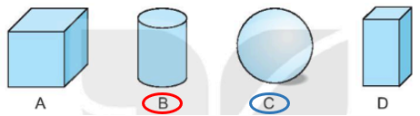 Quan sát các hình vẽ em thấy, hình B là khối trụ nên em khoanh màu đỏ, hình C là khối cầu nên em khoanh màu xanh.