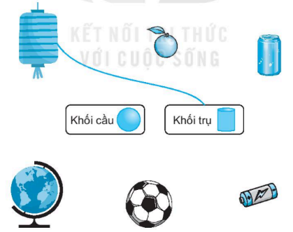 Quan sát hình vẽ, em thấy đèn lồng, lon nước và cục bin là khối trụ. Quả cam, quả bóng và địa cầu là khối cầu. Em nối như sau: