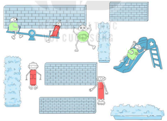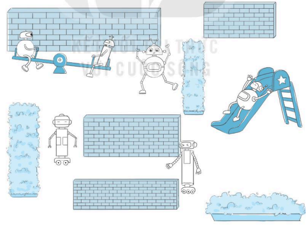 Trong bức tranh, tất cả các rô-bốt đều có thân dạng khối cầu hoặc khối trụ. Em hãy tô màu xanh cho rô-bốt có thân dạng khối cầu và màu đỏ cho rô-bốt có thân dạng khối trụ.