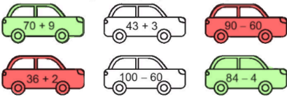Tô màu đỏ vào những ô tô ghi phép tính có kết quả bé hơn 40, màu xanh vào những ô tô ghi phép tính có kết quả lớn hơn 70.