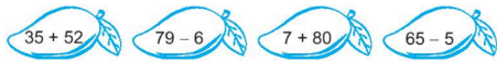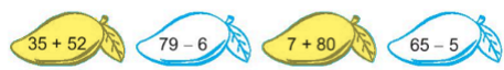 a) Thực hiện các phép tính trong các quả xoài. Tô màu vàng vào những quả xoài ghi phép tính có cùng kết quả.