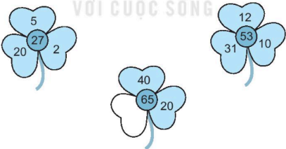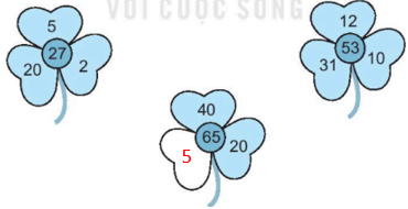 Ta thấy 20 + 40 = 60, vậy số ghi trên cánh hoa còn lại là 5 vì 60 + 5 = 5 hay 20 + 40 + 5 = 65
