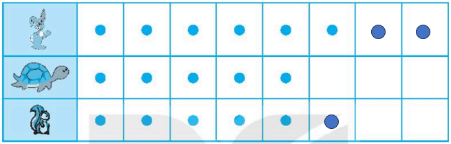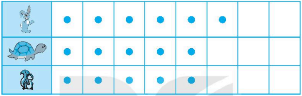 Mỗi con thỏ, rùa, sóc biểu thị bằng một chấm tròn. Trong khu rừng có 8 con thỏ, 6 con sóc, 5 con rùa.