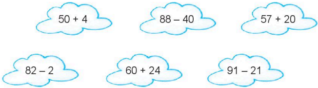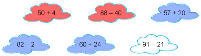 Tô màu đỏ vào những đám mây ghi phép tính có kết quả bé hơn 56, màu xanh vào những đám mây ghi phép tính có kết quả lớn hơn 75.