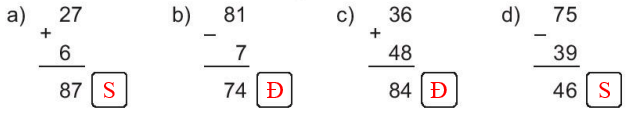 Em thấy phép tính a đặt tính sai, phép tính d có kết quả sai: 75 – 39 = 36, các phép tính còn lại đúng.