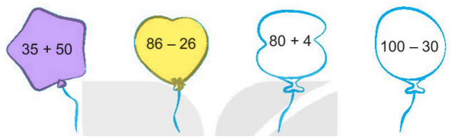 Tô màu vàng vào quả bóng ghi phép tính có kết quả bé nhất, màu tím vào quả bóng ghi phép tính có kết quả lớn nhất.