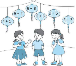 Bạn hoa lấy các đèn lồng ghi phép tính có kết quả bằng 14, bạn Cúc lấy các đèn lồng ghi phép tính có kết quả bằng 12, bạn Bình lấy các đèn lồng còn lại.