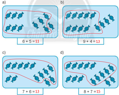 b) 8 + 7 = 8 + 2 + 5 7 + 7 = 7 + 3 + 4 9 + 9 = 9 + 1 + 8 6 + 7 = 6 + 4 + 3 |