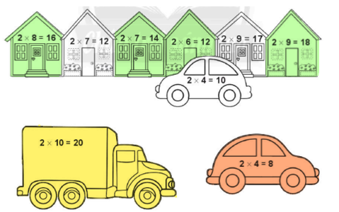 2 × 8 = 16; 2 × 7 = 14; 2 × 6 = 12; 2 × 9 = 18; 2 × 10 = 20; 2 × 4 = 8. Nên em tô màu như sau: