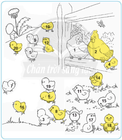 Tô màu các con gà có số là kết quả của phép tính trong bảng nhân 2.