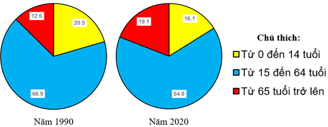 + Giai đoạn 1990 - 2020, nhóm tuổi từ 0 - 14 có xu hướng giảm (từ 20.5% xuống còn 16.1%).