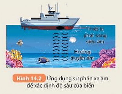 Bài 14.3 trang 45 vở thực hành KHTN lớp 7 Tập 1: Người ta thường ứng dụng sự phản xạ của sóng âm có tần số rất lớn (hơn 20000 Hz) để xác định độ sâu của biển. Hãy sử dụng Hình 14.2 SGK KHTN 7 để giải thích ứng dụng này.