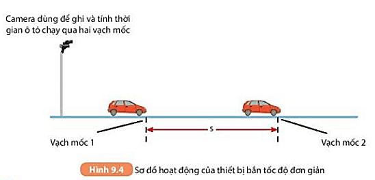 Bài 9.3 trang 31 vở thực hành KHTN lớp 7 Tập 1: Camera của thiết bị “bắn tốc độ” ở Hình 9.4 SGK KHTN 7 ghi và tính được thời gian ô tô chạy từ vạch mốc 1 sang vạch mốc 2 cách nhau 5 m là 0,35s