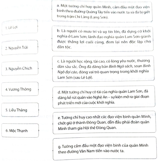 Câu 6 trang 62 vở thực hành Lịch sử 7: Những nhân vật lịch sử nào có vai trò quan trọng trong cuộc khởi nghĩa Lam Sơn? Trình bày những đóng góp của họ.